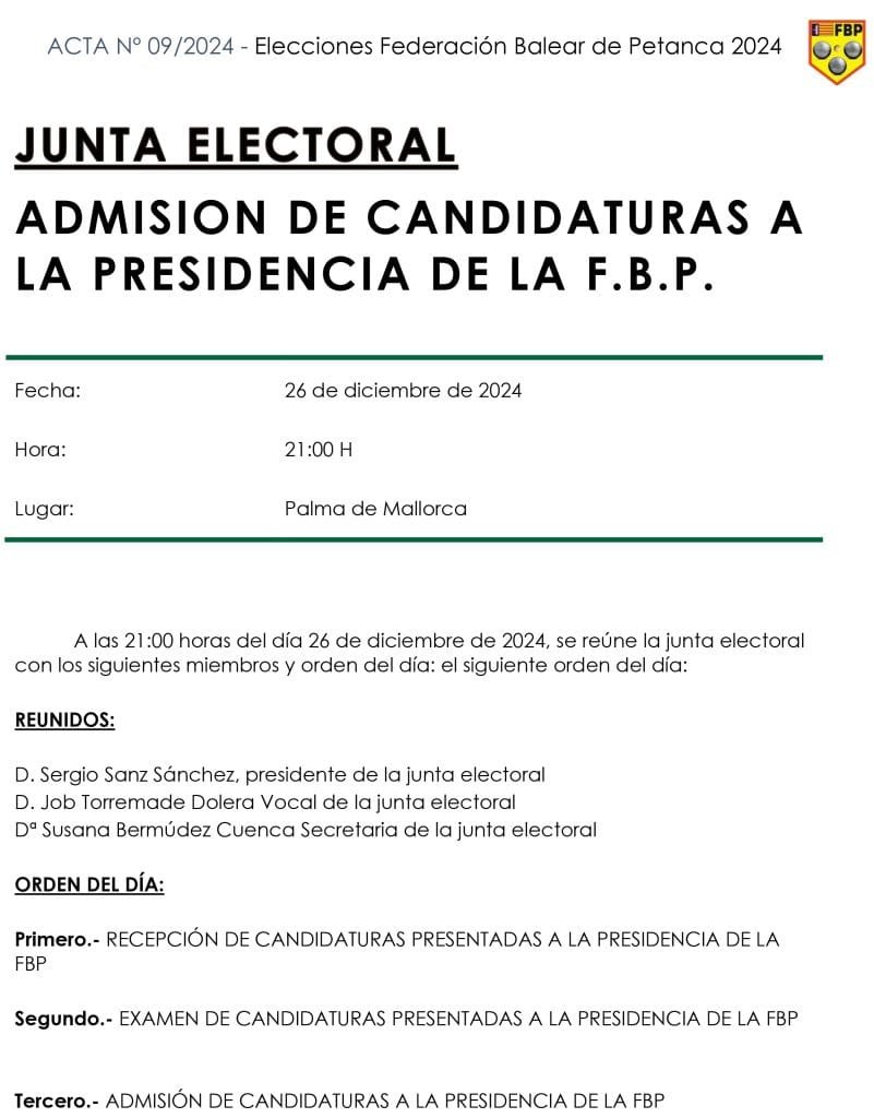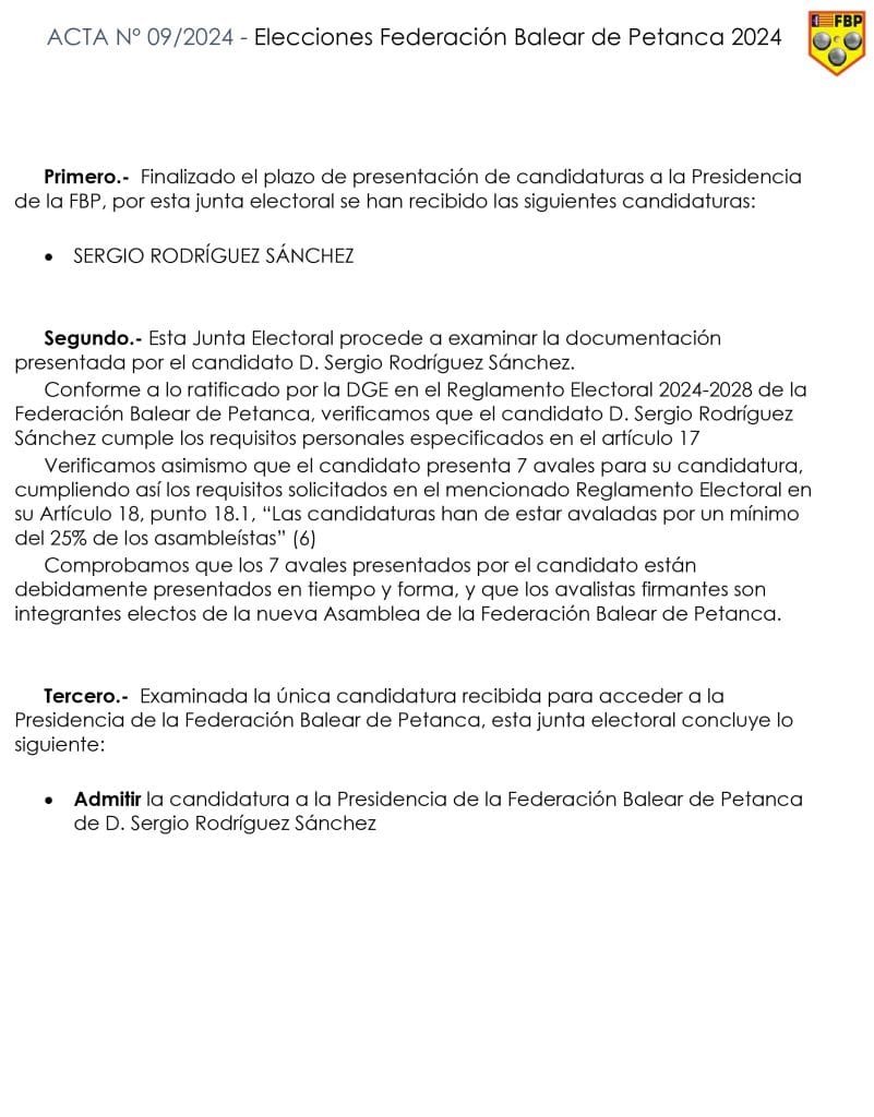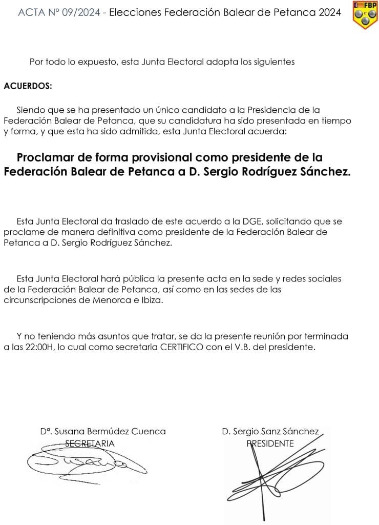 Al tratarse de una única candidatura, y de acuerdo a lo estipulado en el artículo 44 de los Estatutos de la FBP, y al artículo 21 del Decreto 86/2008, desde la Junta Electoral proclamamos a D. Sergio Rodríguez Sánchez Presidente de la Federación Balear de Petanca, a la espera de la ratificación definitiva por parte de la DGE.